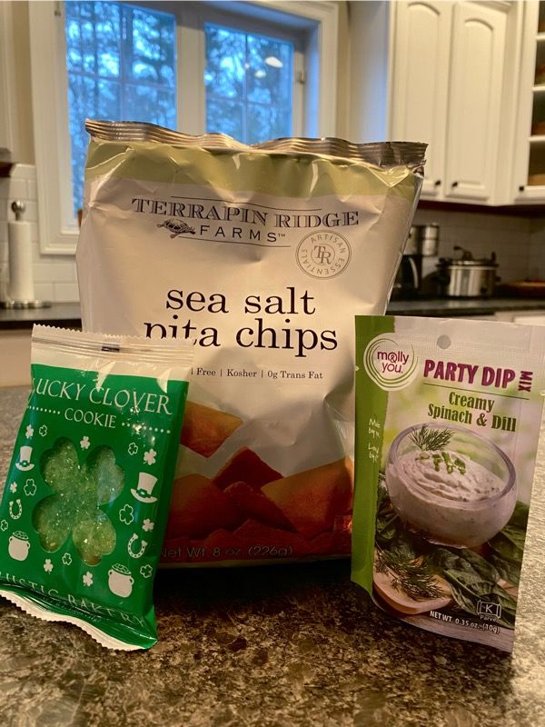 Lucky Clover cookie, sea salt pita chips, and dip mix.