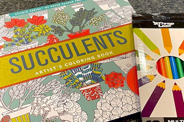 Succulent adult coloring book & colored pencils.