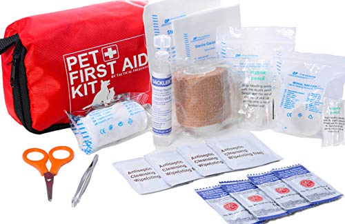 PET MEDICAL KIT: I keep a medical kit in my car for my family, but only recently did I get one for my pups. This kit includes a bottle of saline, roll of self-adhering elastic wrap, roll of gauze, antibiotic ointment, antiseptic wipes, roll of tape, pair of large gloves, metal tweezers, scissors and more.