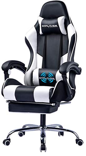 GTPLAYER Gaming Chair with Footrest: This chair has it all! It’s an ergonomic game chair design with free massager lumbar support, headrest pillow, wider and thicker adjustable armrests, an ergonomic shape, larger-size seat cushion, and a sturdy retractable footrest. It can be reclined from 90° to 155°, and the seat-height is adjustable.