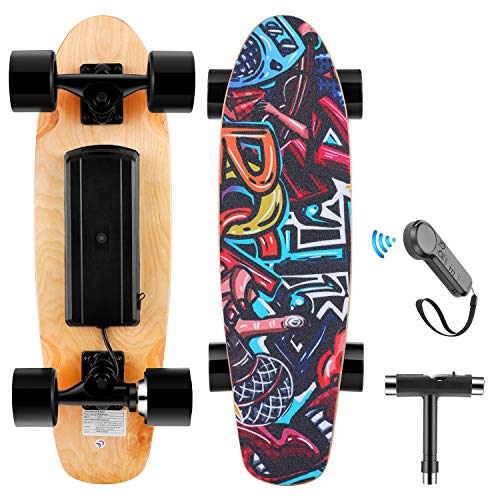 WOOKRAYS Electric Skateboard with Wireless Remote Control: The skateboard comes with a wireless remote control that controls forward, backward, accelerate and brake. The motor has 3 speed modes for beginners or advanced skaters. The skateboard is made of 7 layers of rock-hard maple deck that has good flex, is stable and durable.