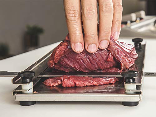 Professional Beef Jerky Slicer: Making jerky doesn’t get any simpler. This meat slicer set comes with everything you need to make delicious jerky. It includes a premium meat jerky slicer, professional 10” chef’s knife, knife guide rails, safety finger guard, recipe book and instant pro seasoning.