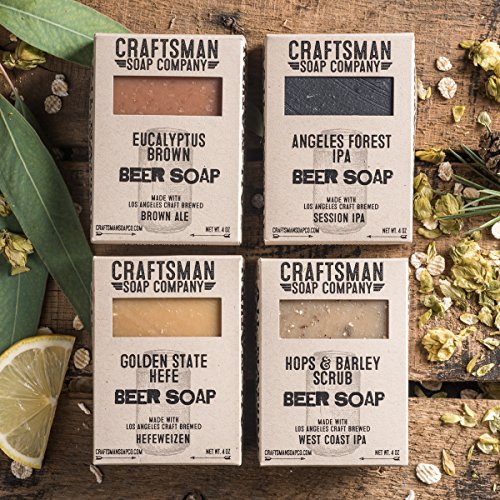 Beer Soap Gift Set: Set of Four 4-oz Bar Soaps that are vegan and palm-free soap. They come in 4 great scents: Eucalyptus Brown, Angeles Forest IPA, Golden State Hefe, Hops & Barley Scrubs.