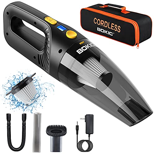 BOKIC Car Vacuum Cleaner Cordless, Cord-Free Handheld Vacuum: Our cordless vacuum cleaner provides 8000Pa strong suction and easily picks up pet hair, dirt, dust, crumbs, dry grass and very small stones. When charged, it can run over 30 minutes. Their portable car vacuum cleaner comes with 3 attachments, the brush for carpet dusting, the crevice nozzle for getting into tight corners and an extension soft hose for hard-to-reach areas.