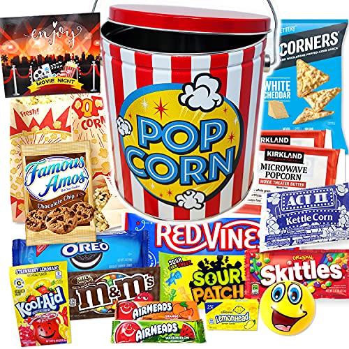 Ultimate Movie Night Gift Basket Snacks: Includes a large reusable tin, a stress ball, 4 decorative popcorn paper bags to fill with popcorn, 2 bags of Kirkland Movie Theater Butter Microwave Popcorn, 1 Act II Kettle Corn, Popcorners, 1 pack of Red Vines, 1 Sour Patch Kids, 1 Lemonheads, one bag of M&M’s, two Airheads, 1 pack of Oreos, 1 package of Famous Amos Chocolate Chip Cookies, one Kool-Aid Strawberry Lemonade Drink mix.