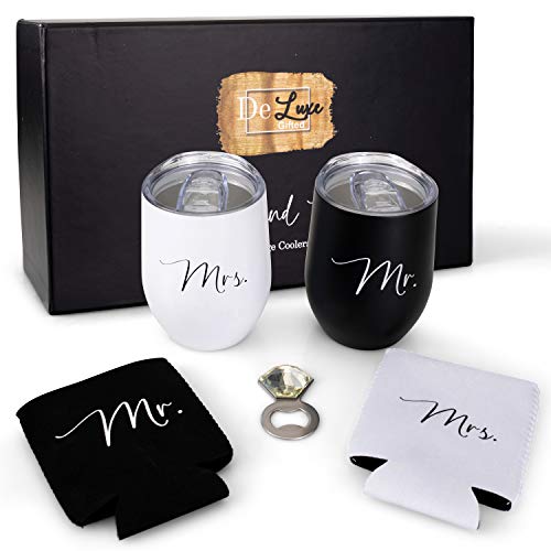 Mr. & Mrs. Wine Tumblers Every set includes 1 Black Mr. wine tumbler, 1 Mrs. wine tumbler, 1 Mr. beer koozie, 1 Mrs. beer koozie, and 1 diamond shaped bottle opener. (These are a cute way to take your wine with you on your adventures)