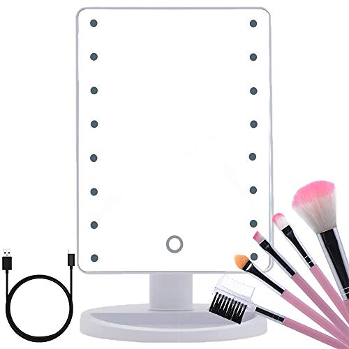 LED Lighted Makeup Mirror with 16 Led Lights: LED lights on / off controlled by the touch sensor on the mirror screen. It comes in black or white and it rotates 180 degrees. It is powered by both battery and USB.