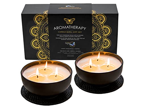 Suziejo Aromatherapy Candle Gift Set: Two beautiful 100% soybean wax candles with 10% essential oil blends of sandalwood & jasmine helps reduce anxiety, tension and stress. The pure white sage, lemon & lavender candle aids in the release and clearing of negative energy. 3 organic cotton wicks for clean and even long burning times of 40+hrs each candle.