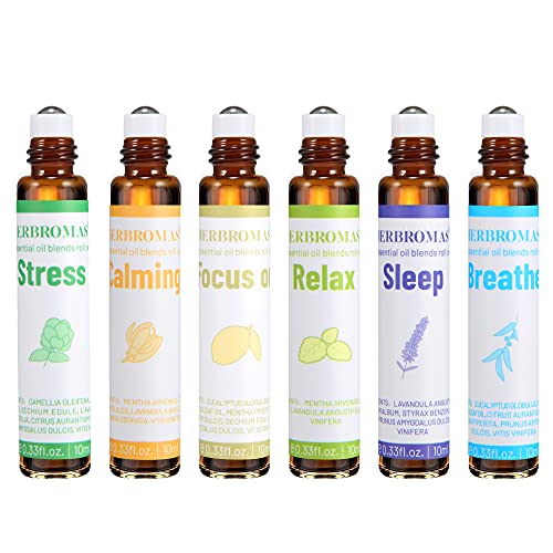 HERBROMAS Aromatherapy Essential Oils Roll On Set: This roll-on blends set contains Breathe, Sleep, Stress, Focus On, Calming, Relax. Good Sleep essential oil smells of lavender and sandalwood, Stress Relief essential oil is minty sweet floral, Relax essential oil is floral and citrus. The essential oil blends set is ready to be applied directly onto pulse points.