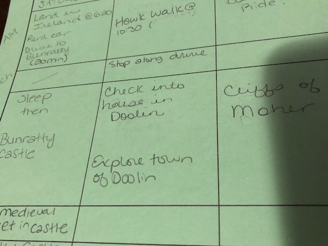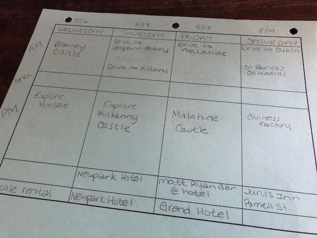When planning our trip, I use a chart to have our trip laid out where I can see it in one place. (Here’s a sample for an Ireland trip.)