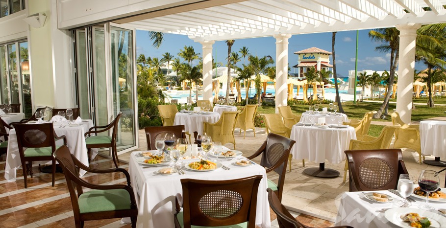 This is the resort’s Italian restaurant. My husband and I had a lovely romantic dinner here, complete with white-glove service. Choose from indoor seating in the midst of intimate pendant lighting and Bahamian-chic décor, or outdoor dining on a beautiful terrace overlooking the charming garden.