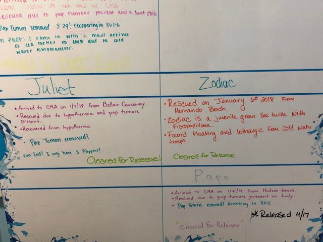 We also got to peek at the board that lists all the sea turtles being treated and we were happy to see that two turtles who had been here since January, Juliet and Zodiac, were going to be released the next day!