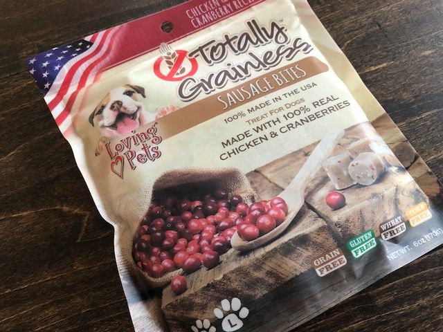 TOTALLY GRAINLESS SAUSAGE BITES (chicken & cranberry flavor): Finnegan loved these treats! They are made with 100% chicken, have no artificial colors or flavors, is wheat free, and also gluten free.