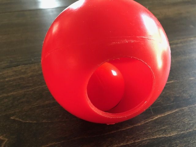 RED BALL: Another favorite, this ball has holes around it and inside is another small ball. He loves to throw it around and since it’s hard to hold on to it rolls away and he has to chase after it.