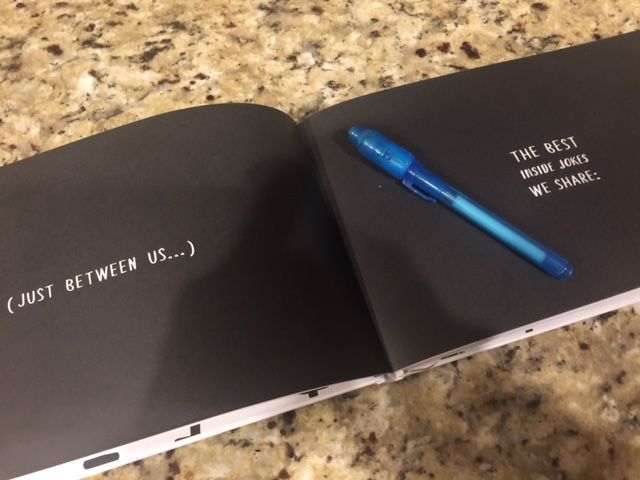 Our absolute favorite is the page where you write down inside jokes that only the two of us know what they mean. The best part is you write it down using an invisible pen that you read with the light on the pen. We had fun with this one!