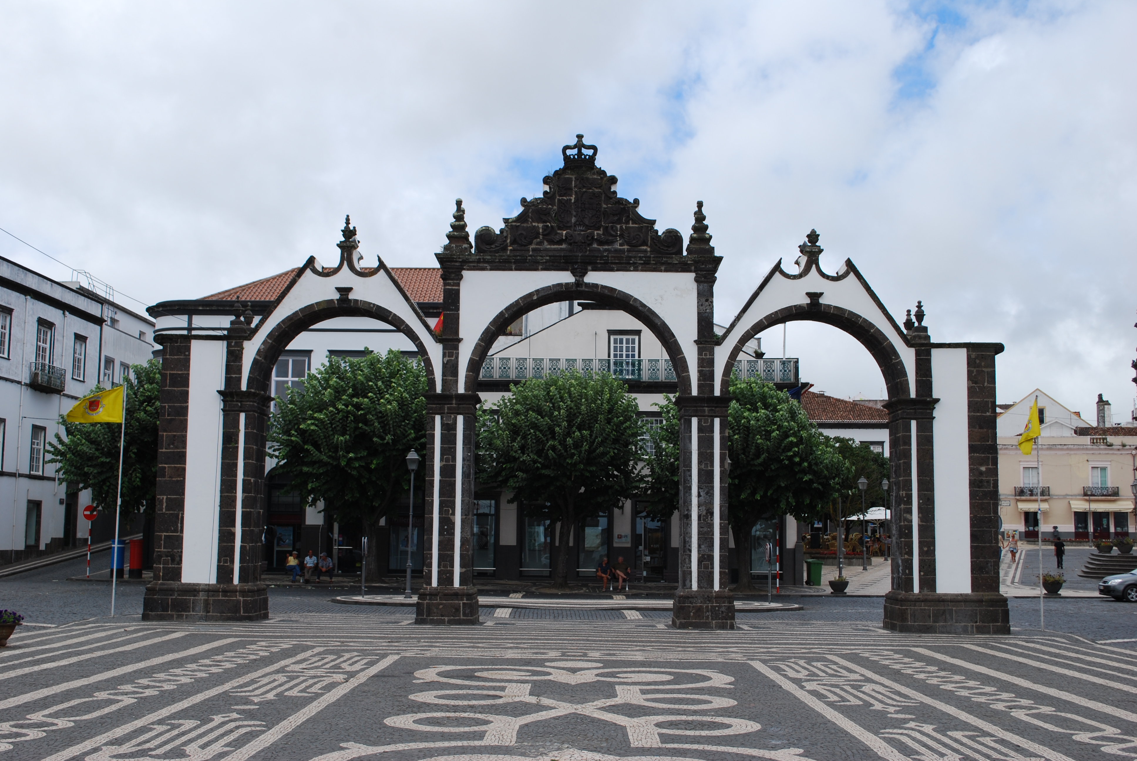This landmark welcomes visitors into the town of Ponta Delgada. The arches, with a lovely church in the background opens up to a town square containing restaurants and some small shops. The black and white stone gives the town a clean look.