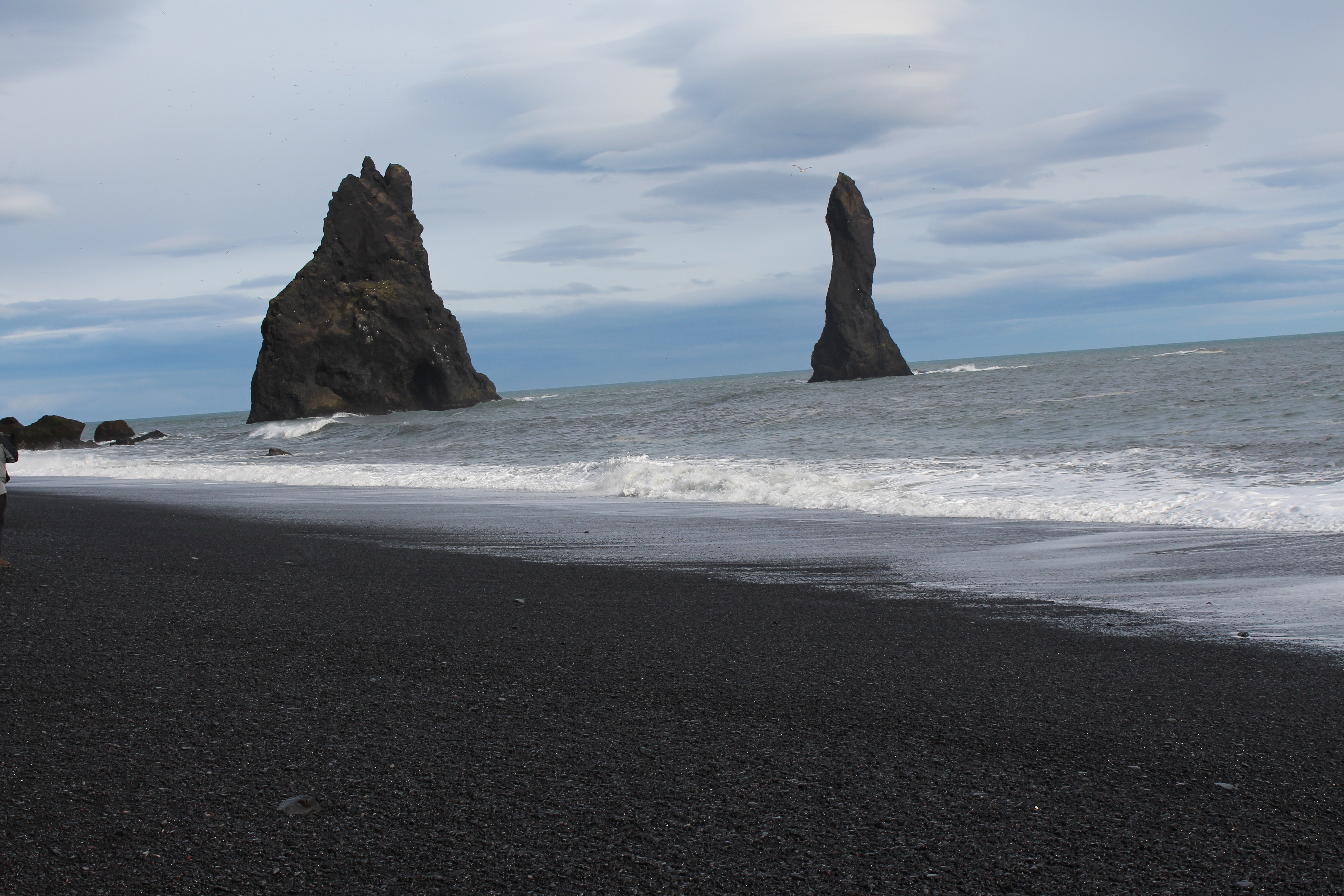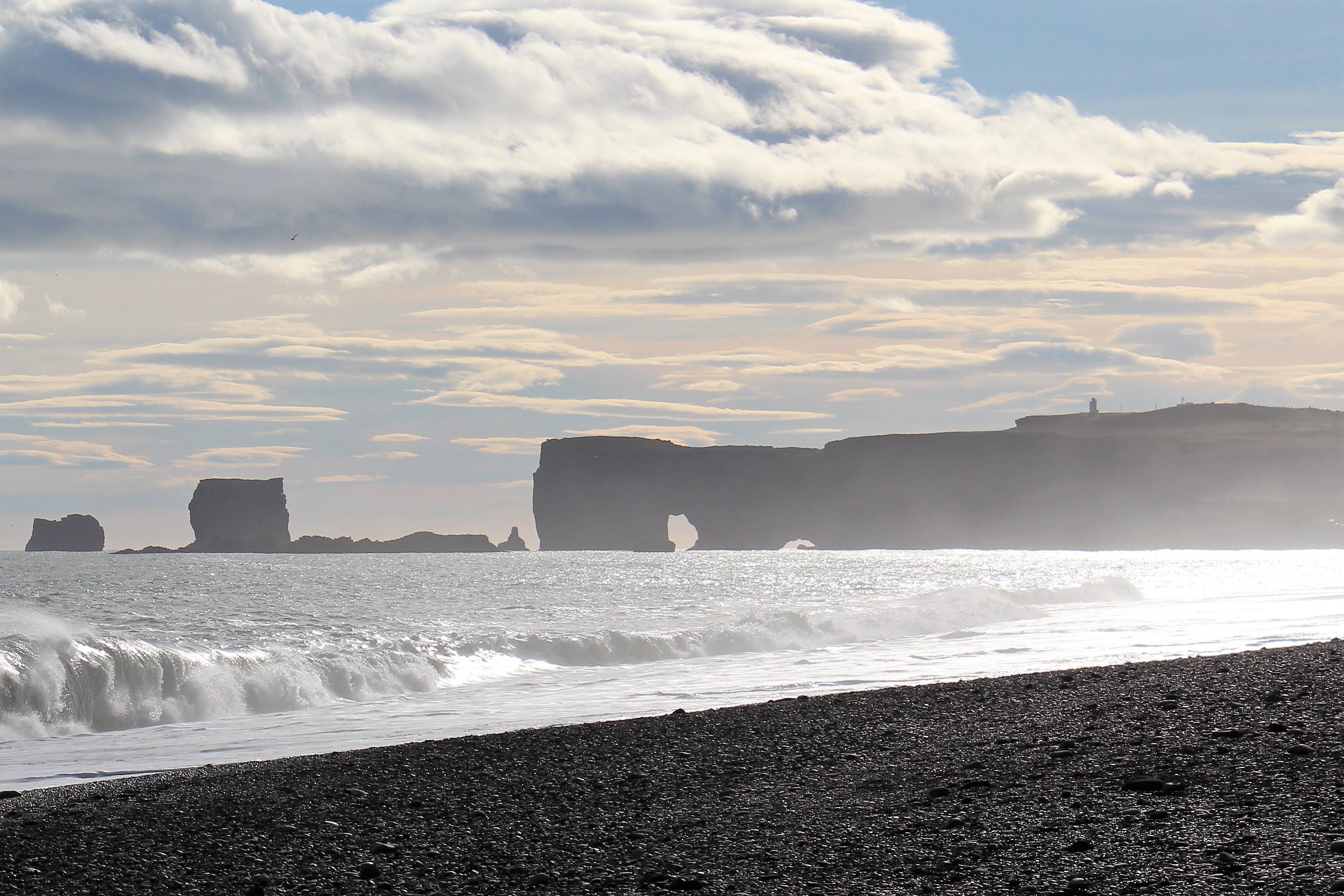 The beautiful beach of Vik will make you feel like you are on another planet. The black pebble beach is bordered by stunning basalt cliffs that have a stair-like appearance. In the distance, you can see a natural bridge, and we were lucky enough to see seals playing in the waves.