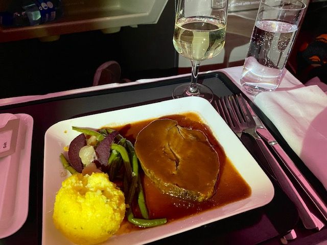 “Brasato” Beef braised in red wine sauce. Polenta with Alpine cheese, green beans, pearl onions, and pear. They paired it with a Swiss white wine.