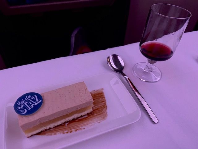 Luckily, they space out all of these courses throughout the flight, so you can enjoy each one. Dessert was a sweet chestnut mascarpone mousse on white chocolate with a pear slice.