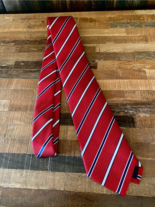We got a lovely red tie with navy and silver stripes. It will go well with many shirt colors.