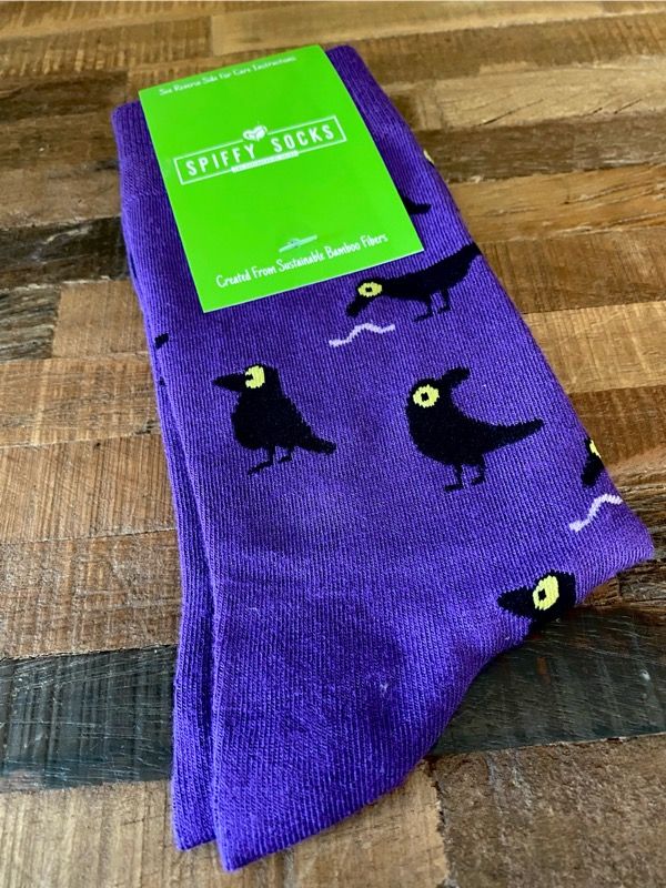 Want some spooky, yet fun socks? Midnight Crows features a purple backdrop with a group of crows perhaps looking to engage in some nefarious activities. It is part of their bamboo sock subscription collection. This pair is super comfortable and soft as well. Fits Men’s size 6-12.5 (but my daughters have been wearing them)They are made from bamboo fiber.