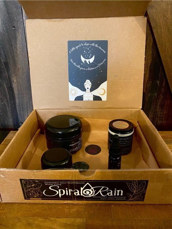 Spiral Rain’s witch box, which we received, is filled with handmade items and simple rituals to include magic in your everyday life. Each month, your box will come packed with supplies that resonate with the energy and theme for that month.