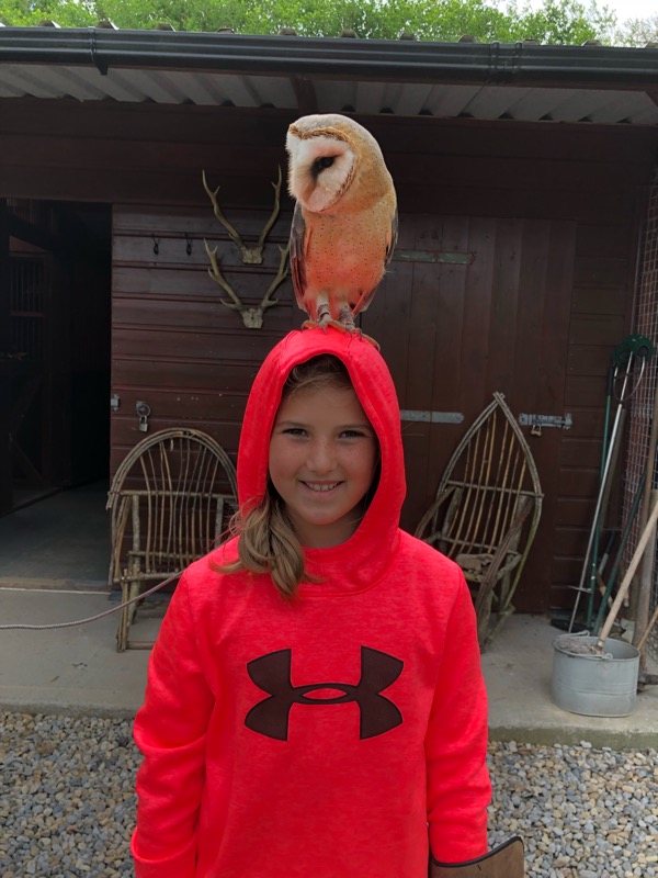 Our guide, Damien, was so knowledgeable about birds of prey and the history of falconry and he welcomed questions about the birds. The girls were impressed that he had an answer for every question. First, we were introduced to Anthony, an impressive Harris hawk.Â