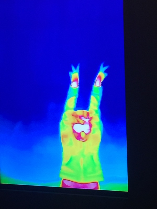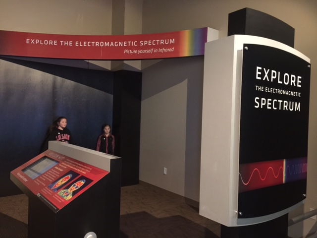 In this exhibit you stand against a wall and the infrared camera will display your body on a screen in infrared light. As you move you can see your body moving on the screen. The girls loved dancing around as their shape changed on the screen.