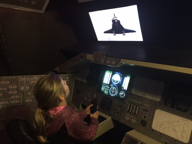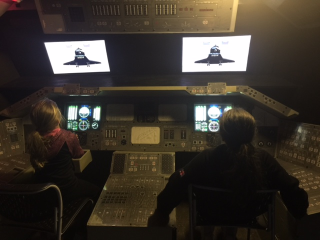 My girls love to take turns sitting in the cockpit and use the flight simulator to make a perfect landing. They listen to directions given by the flight instructor and try to land the shuttle craft. There is also a great simulator where you land a lunar module.