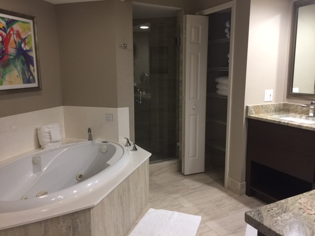 The master bathroom was huge and had a large Jacuzzi tub. The suite provided a hair dryer, iron, ironing board, and a safe. They offered an assortment of toiletries as well as comfortable robes. The glass shower had three powerful showerheads were a treat after a day of playing in sand and salt water.
