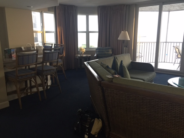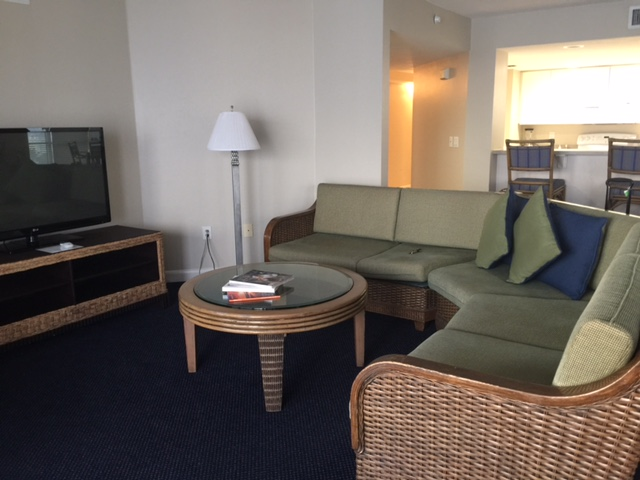 The living room featured a large sectional that wrapped around the room. It was huge and a perfect place for the whole family to stretch out at the end of the day. The room had a large TV and there was even a DVD player. The reception desk offers movies you can rent for (look into the cost of the movies.) Again, the room was light and airy because once again, there was a wall made entirely of glass. With all the glass, I was surprised how quiet the suite was.