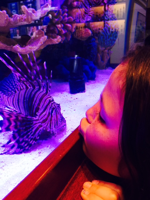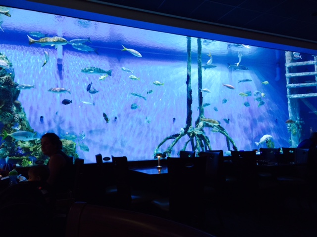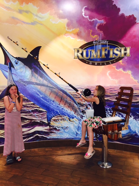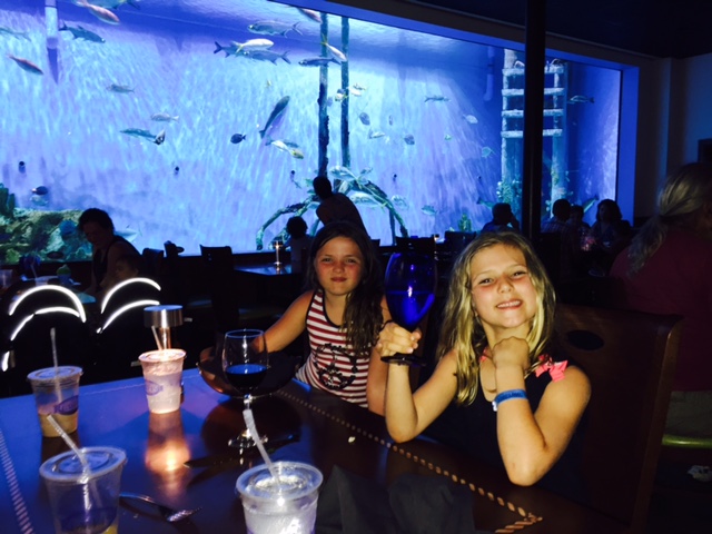 GUY HARVEY’S RUMFISH RESTAURANT:  My girls and I loved this restaurant and they still talk about how cool it is.  The restaurant was featured on the show “Tanked” and the episode is constantly playing on one of the channels in your room.  I would recommend watching the show before going to the restaurant because you will see how much effort it took to create this unique place.  The entire restaurant focuses on a 33,500 gallon aquarium and the amazing fish that live there.  The restaurant is very dark so the aquarium takes center stage. My girls brought coloring books to entertain them at the table but they never opened them up because we sat so close to the tank and they were obsessed with the different types of fish.  They thought it was cool that the menu lights up when you open it.  The menu has plates such as bouillabaisse, seafood brochette, grouper picatta, and four cheese lobster mac.  The kid’s menu has the usual meals but the presentation of the food is beautiful.  Take some time to see the tanks in the bar area.