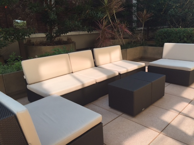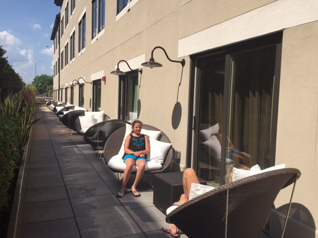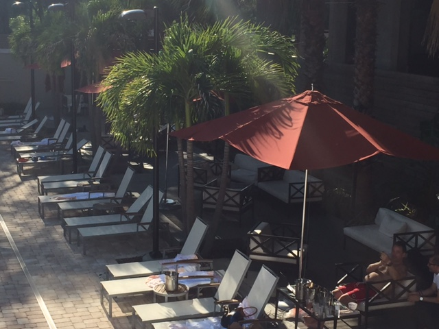 Throughout the hotel there are a variety of seating areas. The lobby has a warm, inviting room with deep couches and TV’s playing cooking shows. Outside there are lots of areas with white couches and you can smell the inviting aromas of fresh basil and rosemary in potted plants.