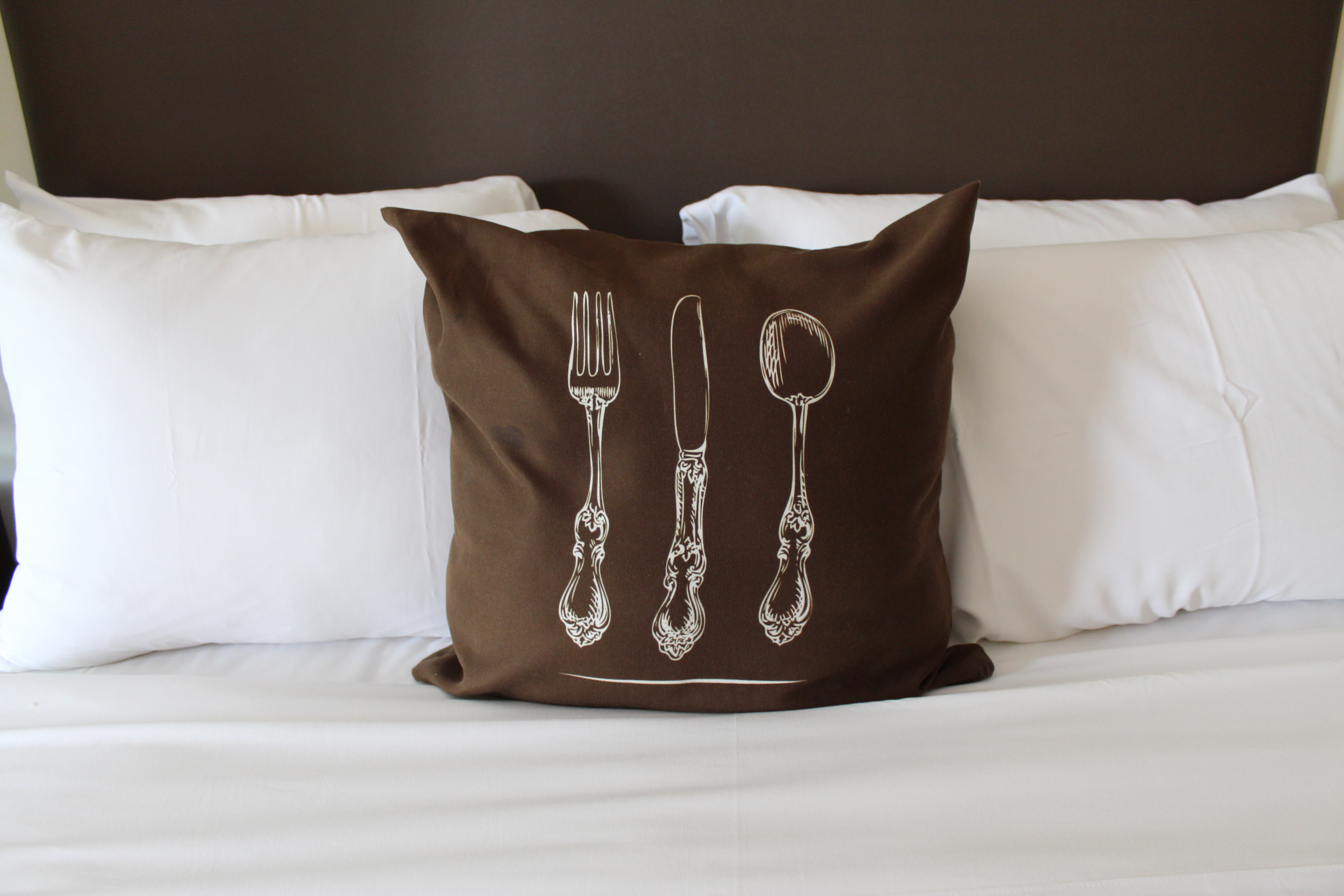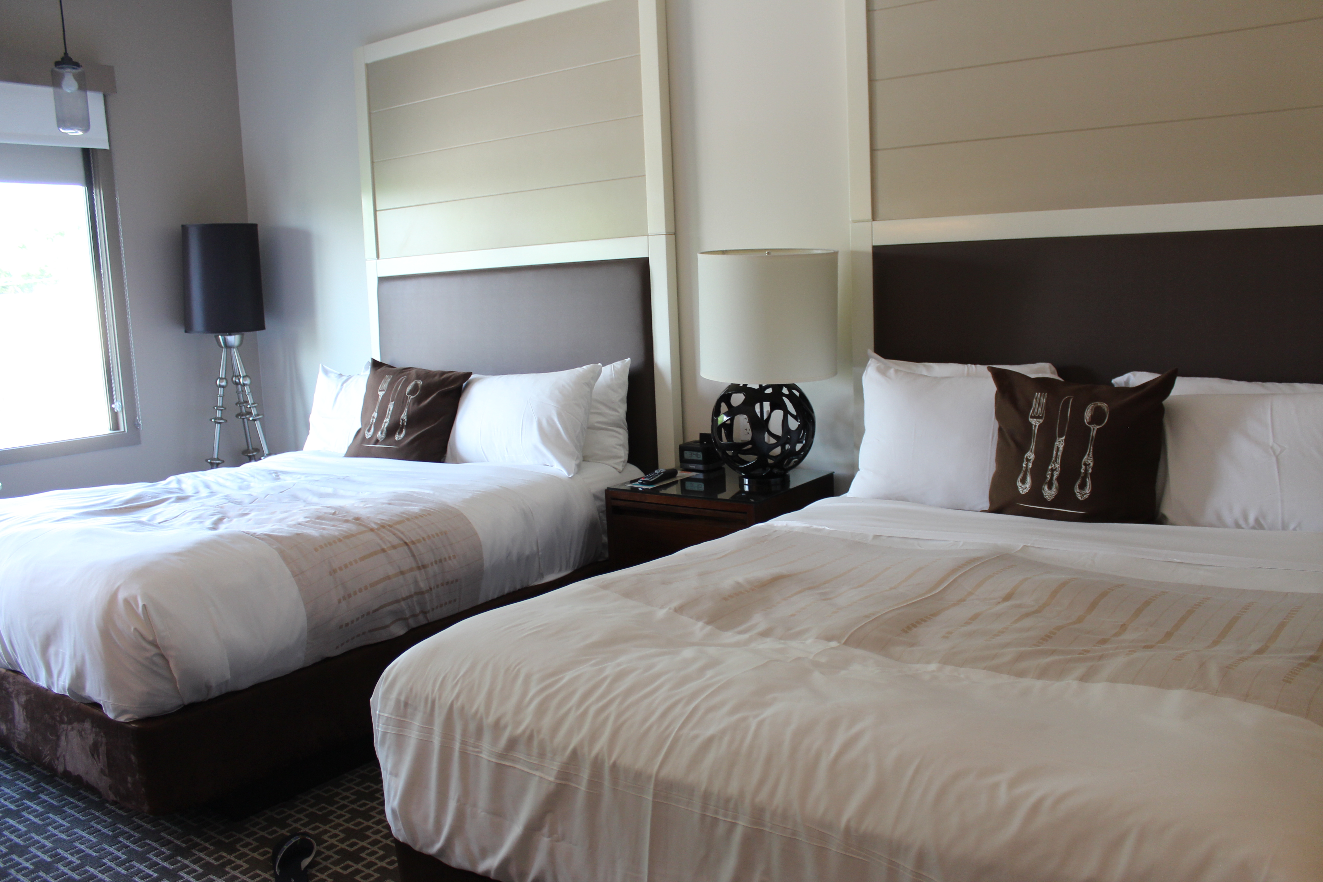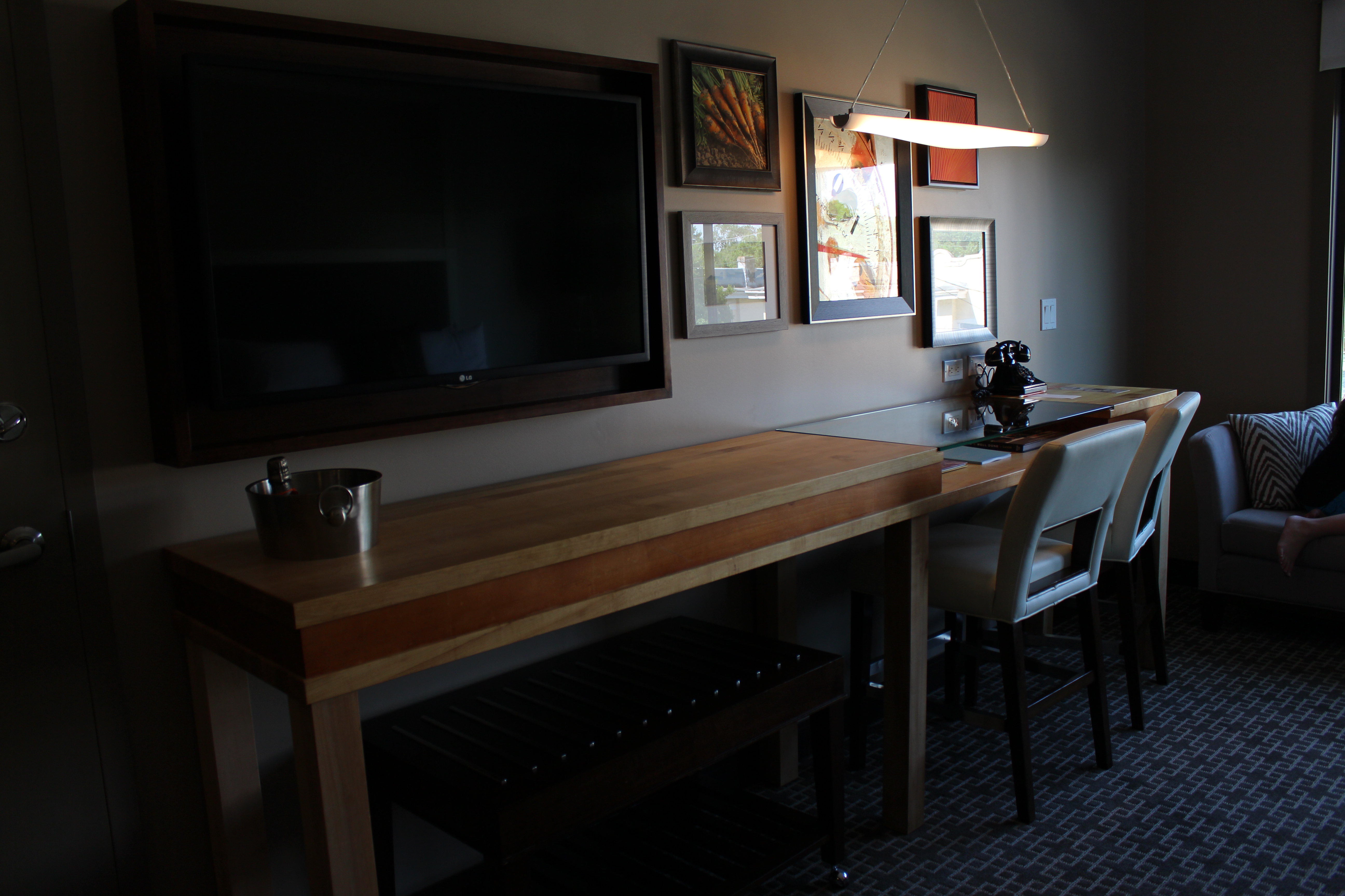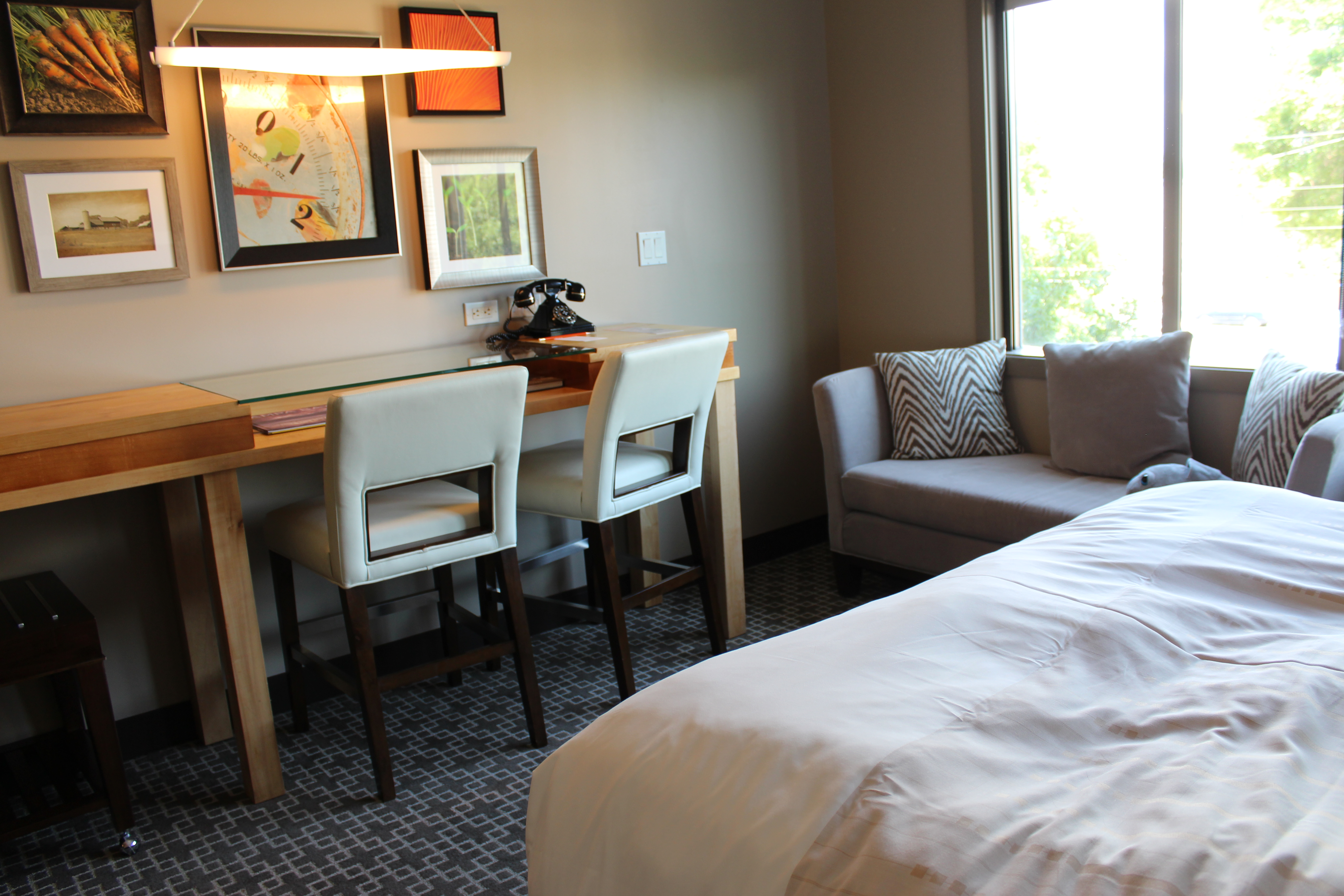 The wine/food elements carry into the guestrooms. Each of the hotel’s 137 rooms contain person touches that make it a memorable stay. The pillows on the bed had utensils stenciled on them and the lighting was made up of glass jars. The room does not lack in creativity…they even used a butcher block as a table. A great touch was the alarm clock that had a built-in phone charger, which saved me because I left my charger at the previous hotel and I needed it for GPS on the way to the airport in the morning.