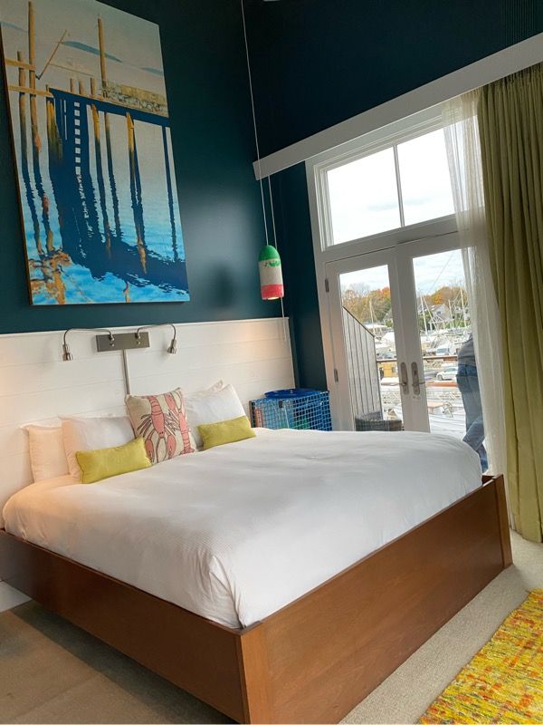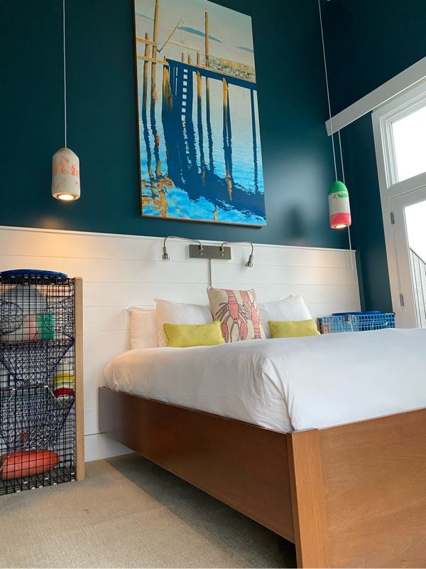I love that the hotel uses deep coastal colors and contemporary nautical accents to pay homage to Kennebunkport’s rich maritime heritage. Just look at those nightstands made from lobster traps, the lobster embroidered pillows, and the buoy lighting!