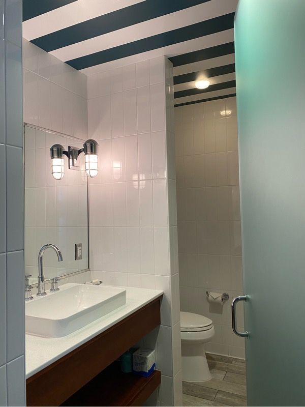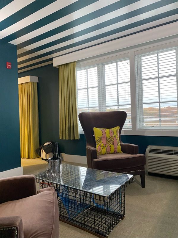 We were upgraded to the Lobster suite and it was absolutely stunning! Let me show you around. When you walk into the suite, you enter into the living room and the first thing your eyes are drawn to is the ceiling! How fabulous are these stripes?!