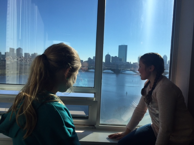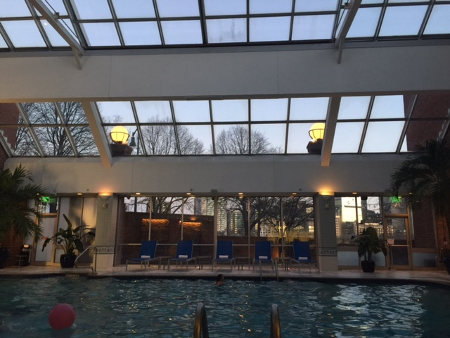 The Sonesta offers a stunning atrium-style lap pool with sliding glass doors that open up to beautiful Cambridg. Because it is chlorine-free and uses salt, it eliminates the chlorine smell you have on your skin after swimming. I decided not to go swimming, but it was so pleasant to sit in the pool area watching the girls swim. I hate when hotels keep the pool area as warm as a rain forest. The amount of sunlight that comes through all the glass makes the pool so unique. In the summer, they open the glass roof and show family movies in the pool area so kids can watch a movie as they swim!