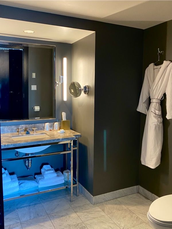 Our bathroom was huge, especially for a hotel in the city. It had marble floors, dark walls, and a shower/tub. There was a large vanity, which was perfect for two people getting ready at the same time. The cozy cotton robe was a nice treat.