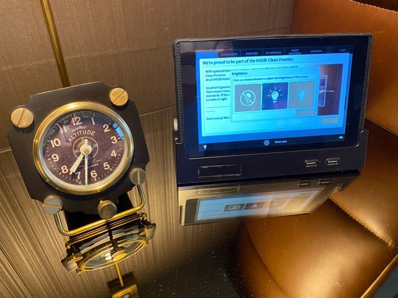 The room had modern amenities but also pays homage to classic elegance of the past. For example, on the nightstand is an in-room tablet and this vintage clock.