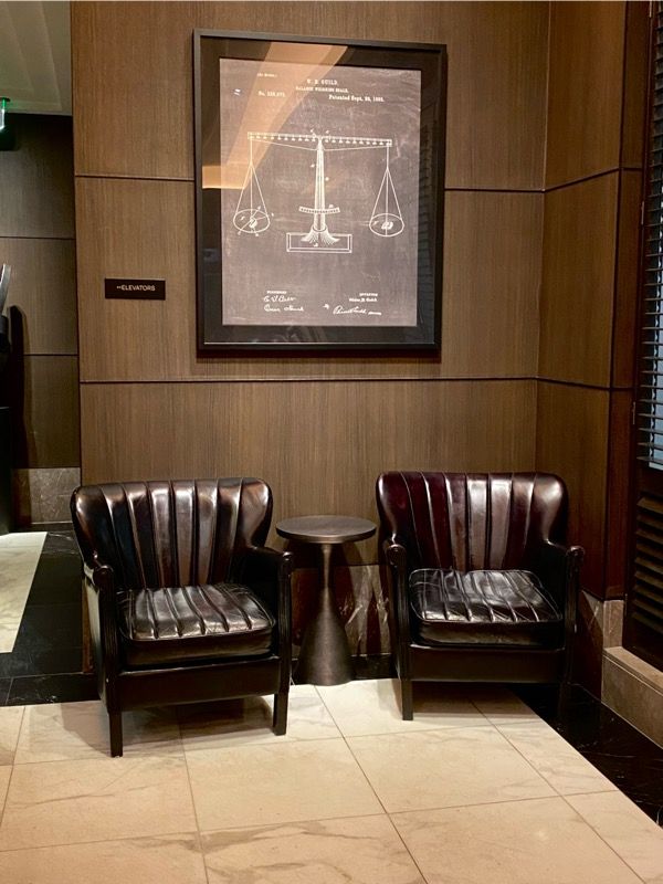 The first thing you’ll notice when you walk into the room are the use of leather and wood. They immediately give an approachable elegant feel.