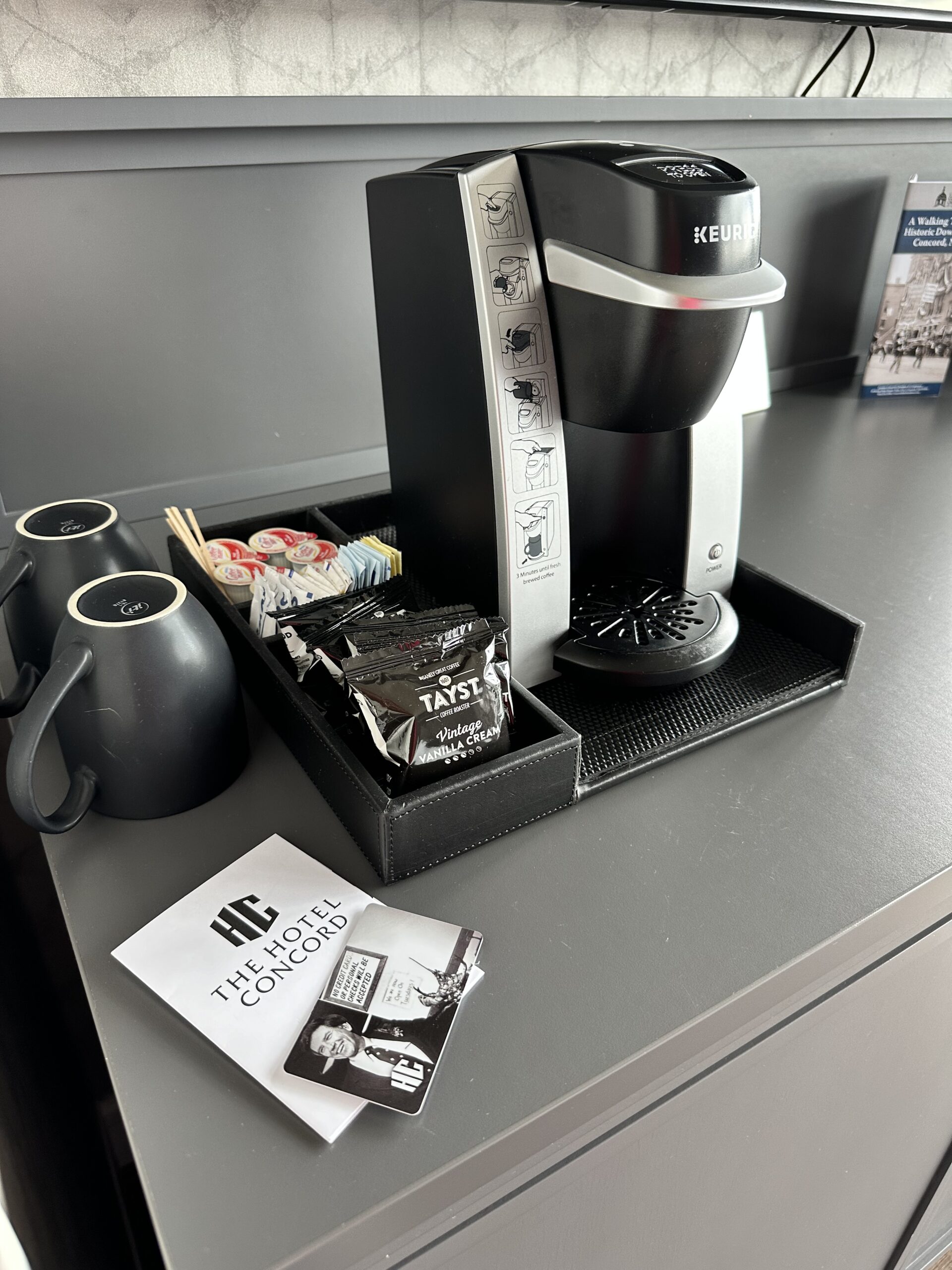 The room had a Keurig coffee bar with a selection of coffee and tea, including flavored coffee (which you know I love!) I also loved the stylish swirled glass drinking glasses.