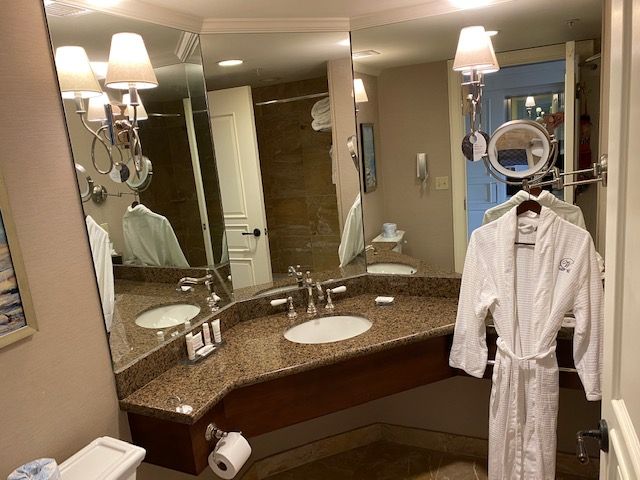 My bathroom had beautiful marble floors and counter space that was fine for one person. It had a shower/tub combo. The hotel provides a blow dryer, iron, ironing board, and even an in-room safe. They also provide some cozy robes in case you want to lounge around.