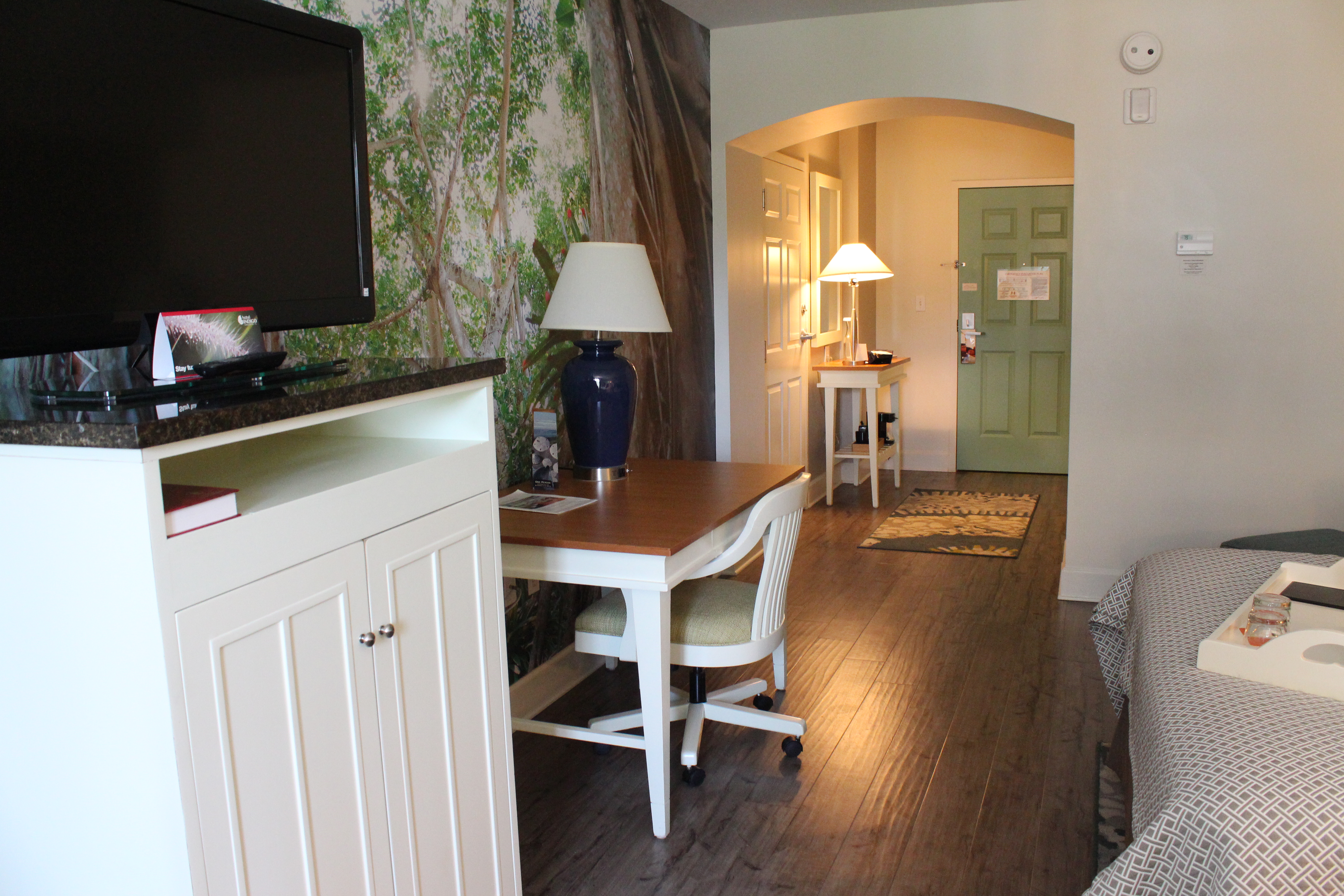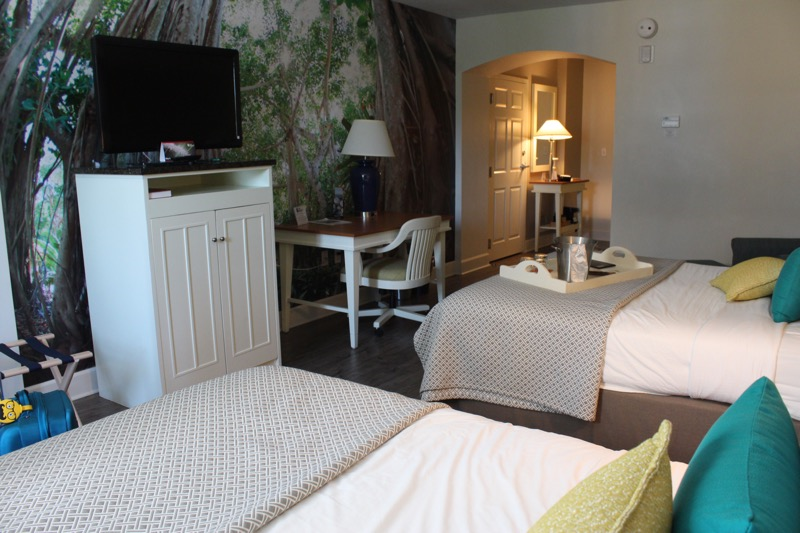 There are 95 rooms in this lovely four floor hotel so they are able to give each room a personal touch. When we walked in we were pleased to find chocolate covered pretzel rods waiting for us. On one wall was a large mural of Marie Selby Botanical Gardens and it created a tranquil feeling. Our room had two queen size beds and a great wardrobe to hang our clothes. It was tastefully decorated with a crisp white décor and pops of color throughout.