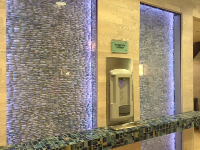The hotel is very environmental conscious and they have a carafe in each room that you can fill up at the hydration center in the main lobby. We loved that!
