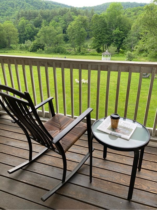 The room had a lovely step out balcony with two rocking chairs and a small table. The large lawn area was the perfect backdrop to my room and you could see the river. It was the perfect place to have some Vermont cider.