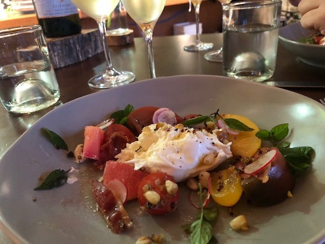 We started with a Maplebrook Burrata Salad (Garden Tomatoes/Flowering Herbs/Watercress Puree/Charred Corn/Crispy Speck)