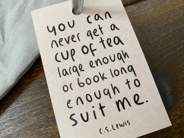 I love the tag on it that has a quote from CS Lewis, “You can never get a cup of tea large enough or a book long enough to suit me.”
