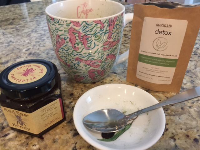 Today is the Superbowl and my boys are playing so I need to finally kick this head cold. I decided to drink the detox as a tea since it has matcha powder in it. I even used some of the Red Bee honey in it.