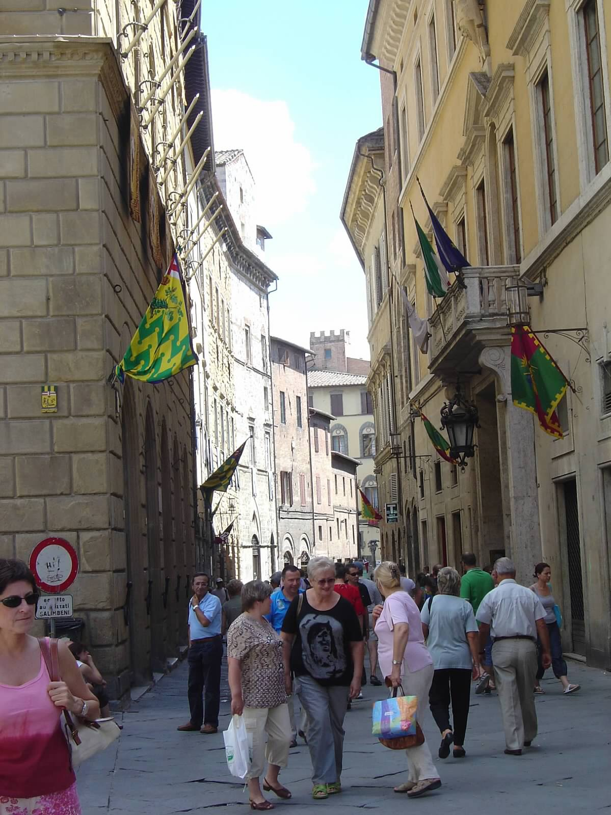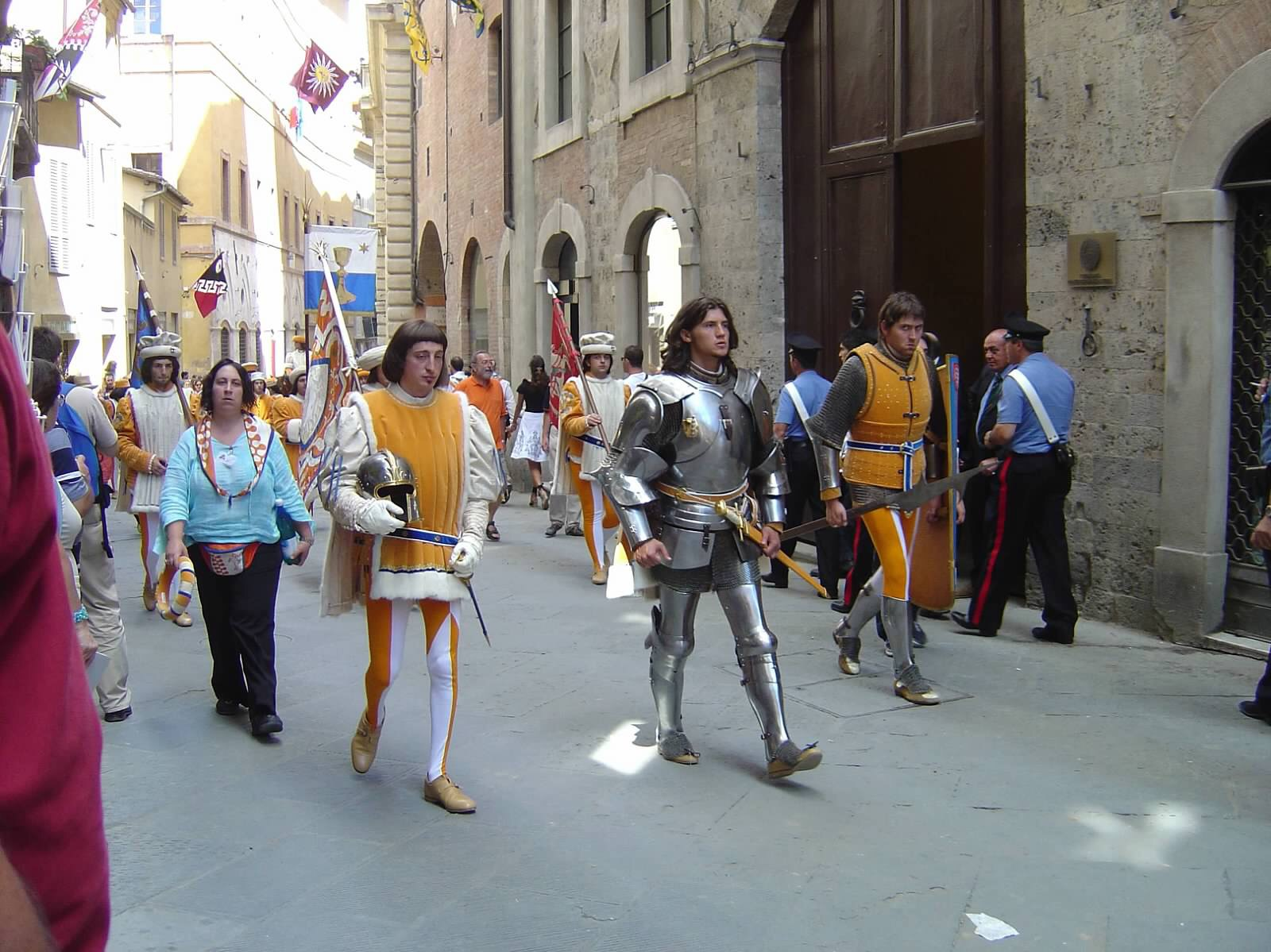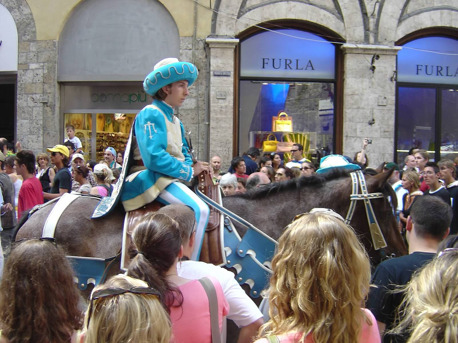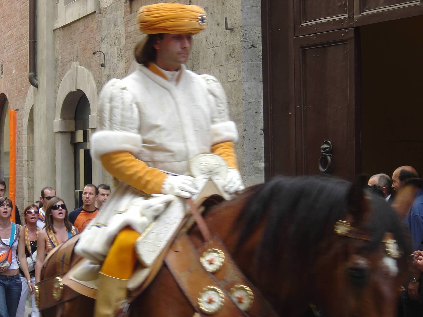 Throughout the day the different districts parade their jockey throughout the town. Both the horse and jockey are donned in colorful costumes in the distinct colors and symbols of their district. There are flag throwers and people chanting as they follow the jockey throughout the streets. The crowd around them is dressed in medieval outfits and they are adored as they stride through town.