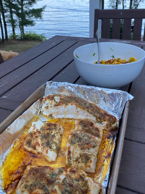 I went to the farmers market this week and bought some halibut and sea bass so I decided to use those instead of the salmon. I didn’t use parchment paper but it came out perfectly in the oven in a roasting pan. I love that you can alter parts of the recipe to make it work for your family. The fish came out amazing! I love the idea that you add the seasoning to the room temperature butter and then spoon it onto the fish. I’m going to continue using this method throughout the summer. I paired ours with a corn salad.
